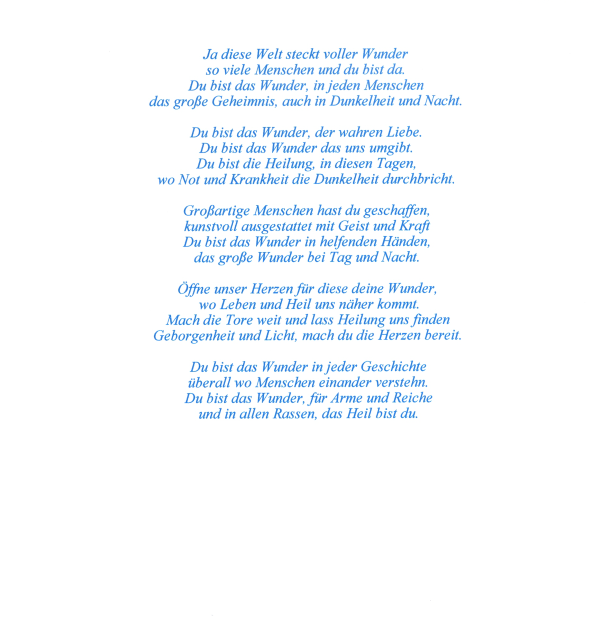 "Du bist das Wunder" ReinhörenIm Billetinneren befindet sich eine CD mit dem Lied in Top-Qualität und der Text des Liedes.Preis pro Billet 7,-- €office@irmgard-thomas.com
